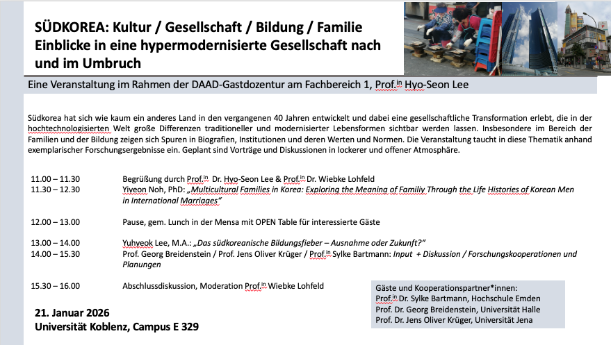 Der Forschungsworkshop hat interessante Vorträge, Diskussionen und Visionen rund um die hypermoderne Gesellschaft von Südkorea zusammengeführt. Wie ist das BIldungssystem in Südkorea? Wie funktionieren dort multikulutrelle Familien? Wie ist der Umbruch von Tradition zur Moderne zu verstehen? Wie lernen Schüler*innen in Südkorea? .....und viele Fragen mehr konnten diskutiert werden.