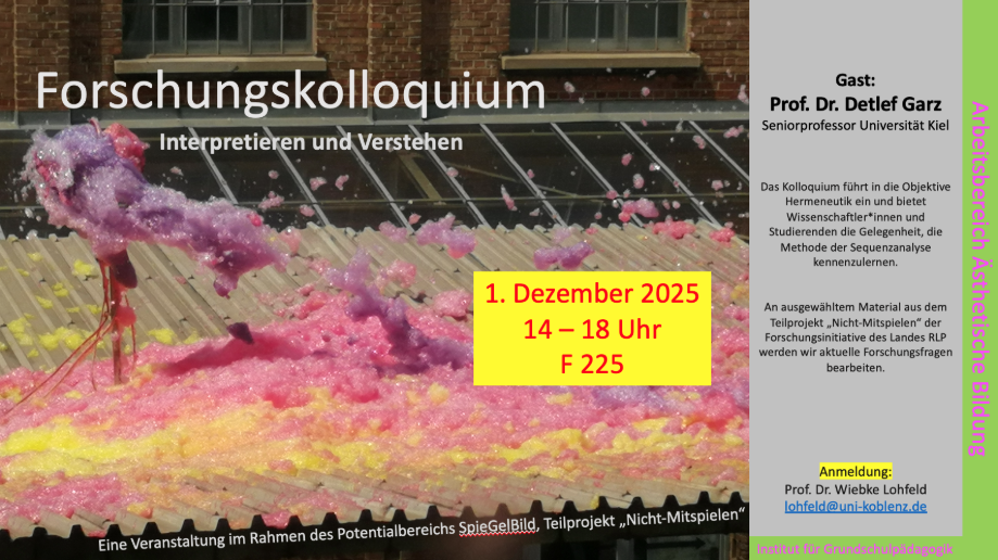 In regelmäßgen Abständen organisiere ich Möglichkeiten für die Arbeit an Forschungsmaterialien. Im WS 25/26 wir das Kolloquium mit der Objektiven Hermeneutik unter der Leitung von Prof. Dr. Detelf Garz, Seniorprofessor an der Universität Kiel, stattfinden. Prof. Dr. Garz hat umfänglich zur Methode und zur Methodologie der Objektiven Hemeneutik publiziert. Eingeladen sind Studierende, Wissenschaftler*innen und Kolleg*innen der Universität Koblenz. Das Angebot ist offen, es bedarf keiner Voraussetzungen. Um Anmeldung (lohfeld@uni-koblenz.de) wird gebeten.