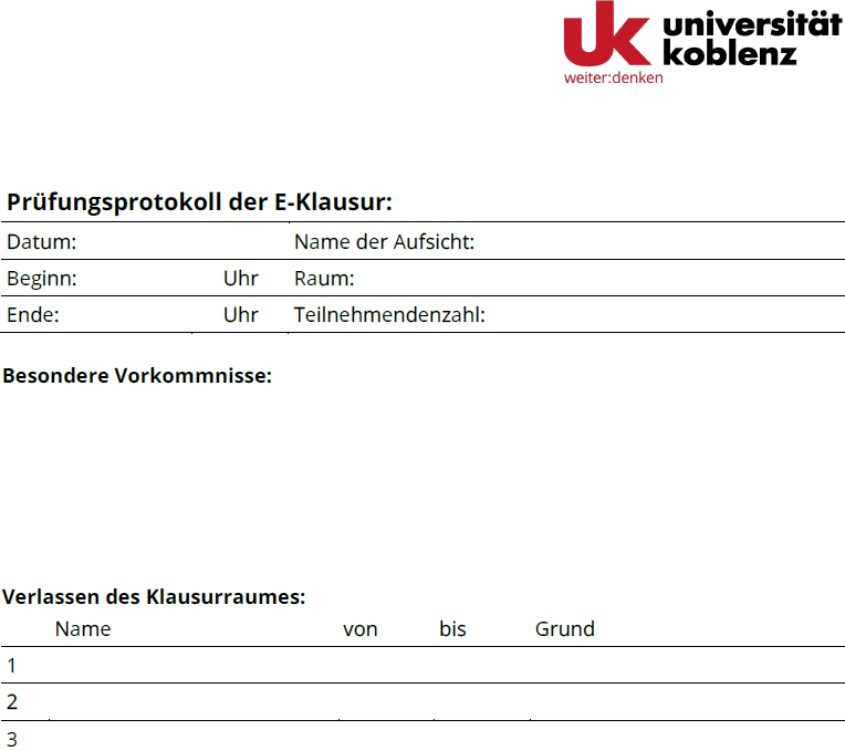 5. | Benötigte Materialien und Unterlagen für die Durchführung bereitgestellt (Deckblätter, Prüfungsprotokolle für Aufsichten bei E-Klausuren, ggf. weitere Unterlagen für die Studierenden) | |