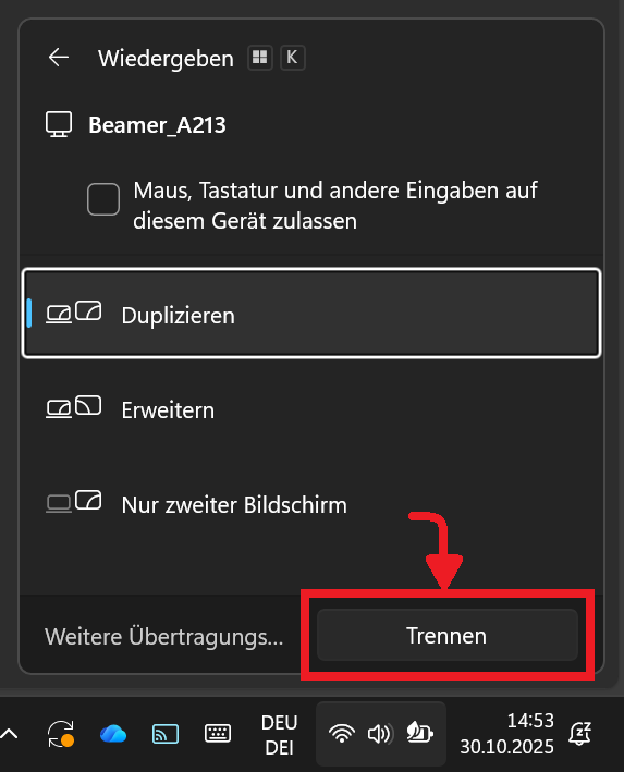 Wählen Sie in der Liste der verfügbaren Beamer den mit der Bezeichnung Ihres Raumes. Die Übertragung startet.