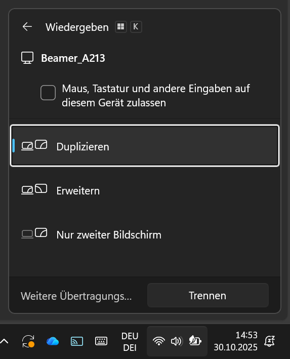 Nach erfolgreicher Verbindung können Sie auswählen, ob Sie Duplizieren, Erweitern oder den zweiten Bildschirm übertragen möchten: