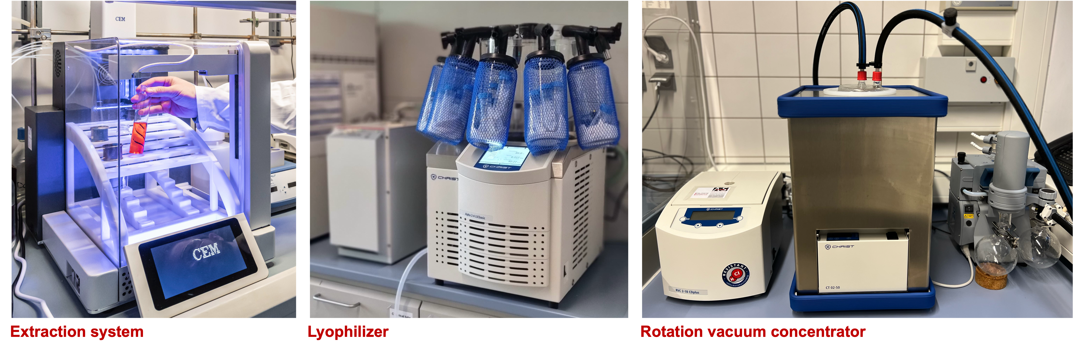 Alpha 2-4 LSCplus (Lyophilizer, Christ): 4 kg condensator capacity, -85°C condensator temperature, chemical resistant vacuum pump.