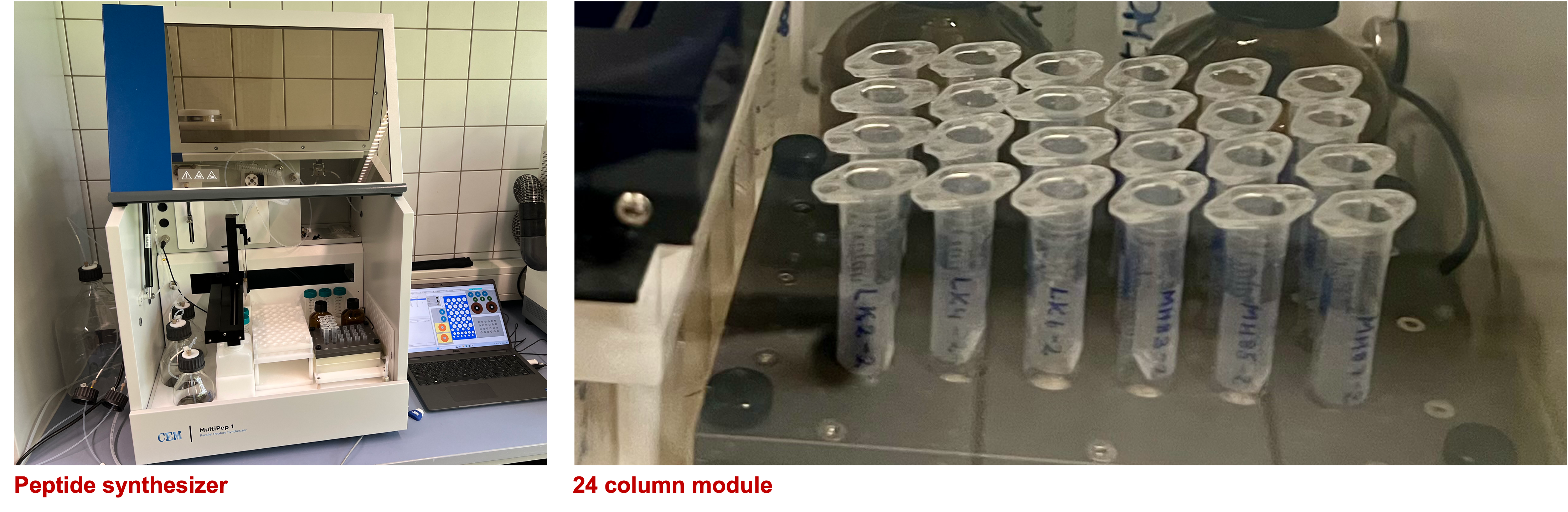 MultiPep 1 (Parallel peptide synthesizer, CEM): Automated solid-phase peptide synthesis, automated synthesis of peptide arrays on resin in 96-well filter plates and of membrane-bound peptide arrays (SPOT synthesis).