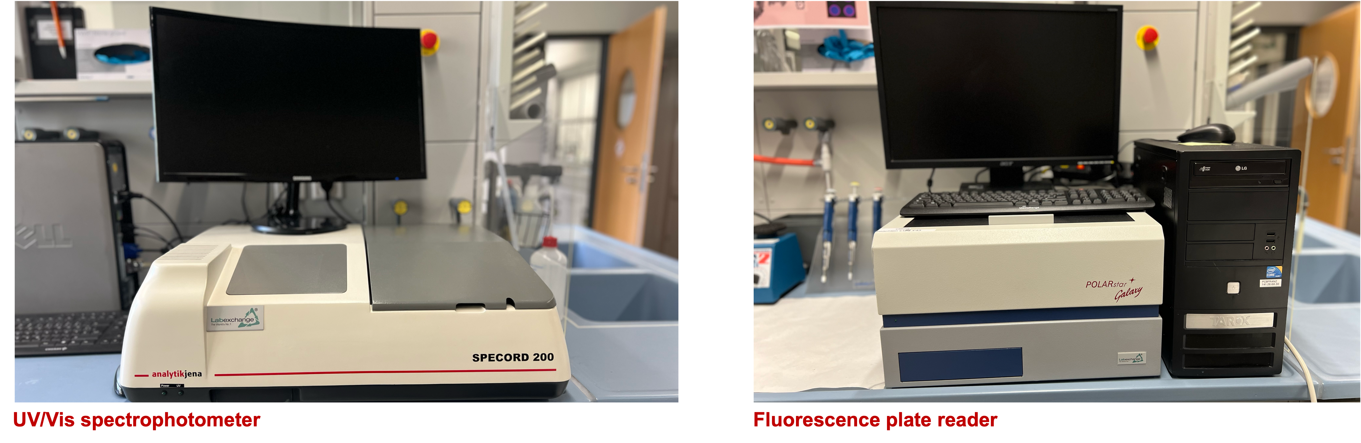 POLARstar Galaxy (Fluorescence Plate Reader, BMG Labtech): Absorbance, fluorescence intensity incl. FRET, time-resolved fluorescence (TRF), luminescence, fluorescence polarization.