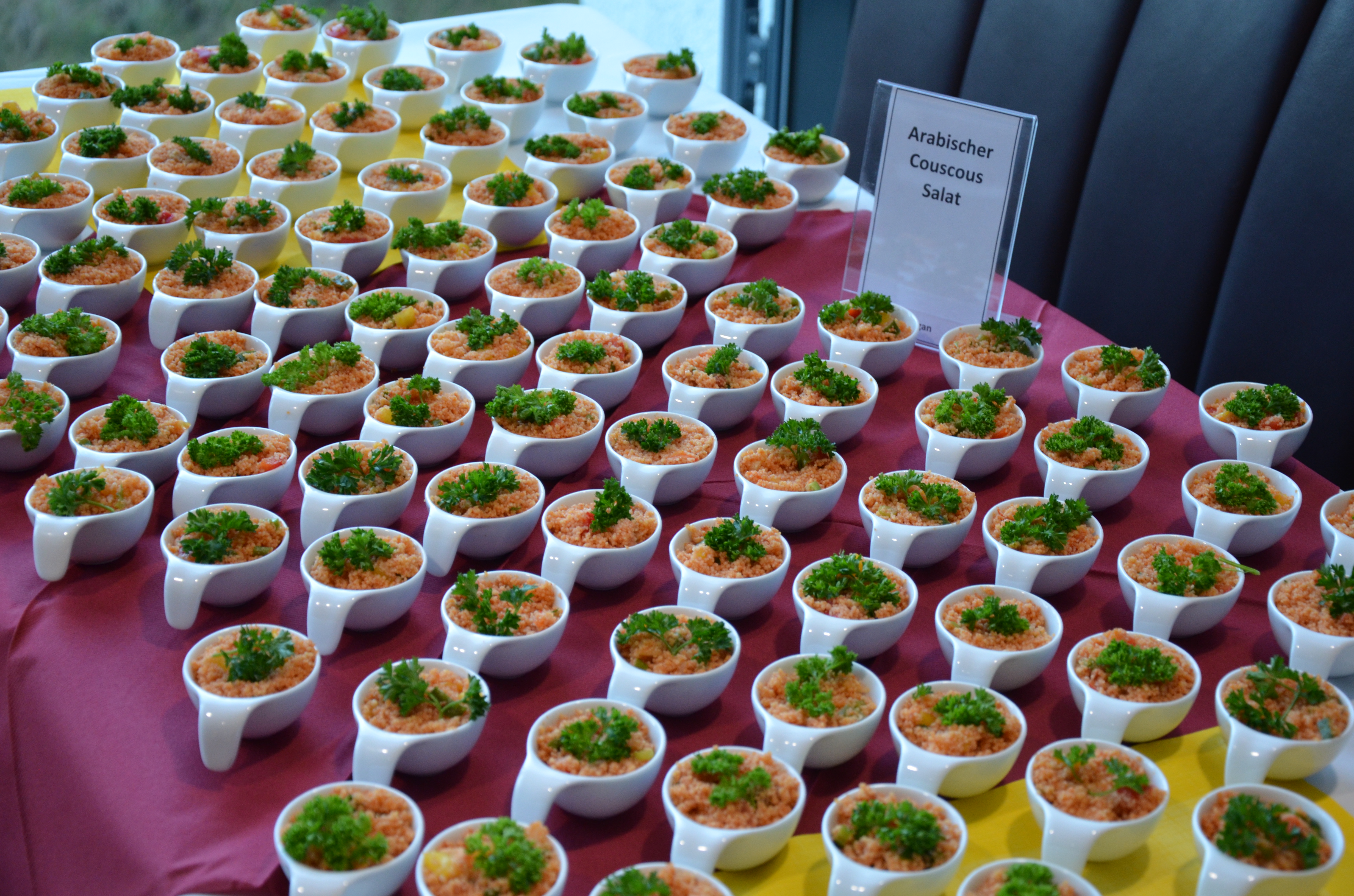 - Vorspeisen: Tomate-Mozzarella-Spieße // Gemüsesalat mit Landschinken // Arabischer Couscous-Salat