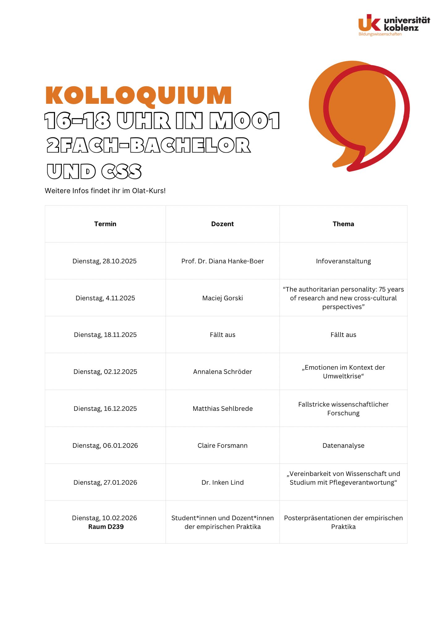 Auch in diesem Semester dürfen wir euch herzlich jeden zweiten Dienstag von 16:00-18:00 Uhr zu unseren Kolloquiumsvorträgen in Raum D 239 bzw. M001 einladen.