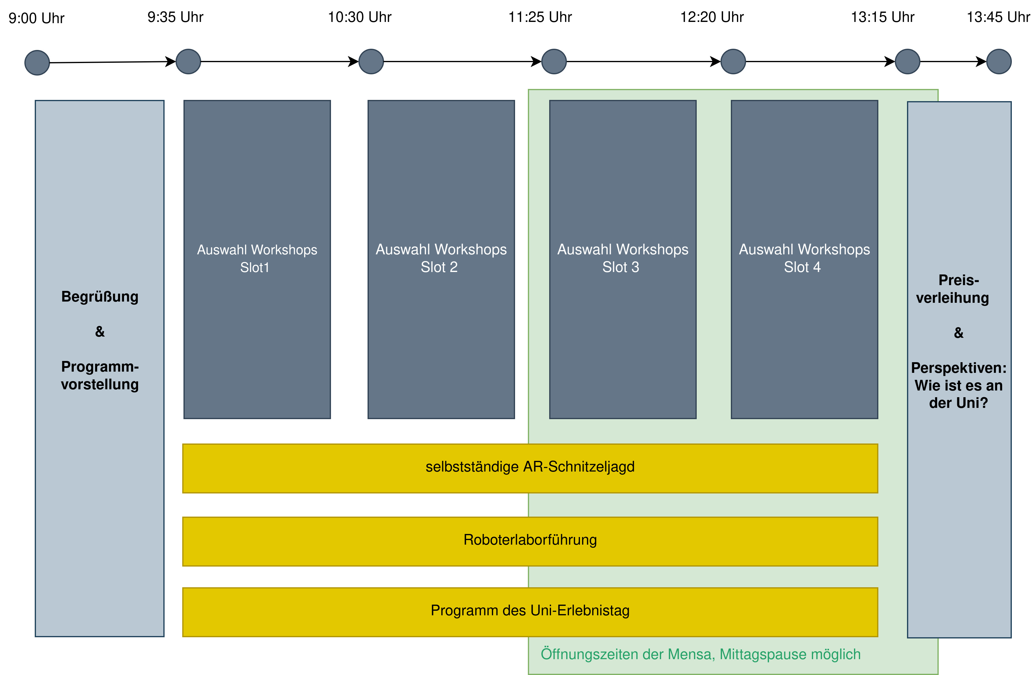 Die Abbildung unten zeigt zeigt den Ablauf. Es sind Workshops geplant unter anderem zu den Themen Robotik, KI und 3D-Computergrafik.