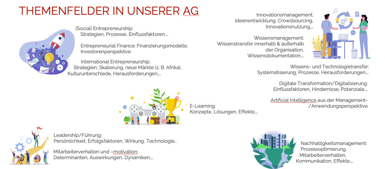 Unsere Arbeitsgruppe betreut ausschließlich Abschlussarbeiten (Bachelor- und Masterarbeiten), die innerhalb ihres Kernbereichs – dem Management von Information, Innovation, Entrepreneurship und Organisation – liegen. Bitte bewerben Sie sich per E-Mail mit einem Motivationsschreiben (Vor-Exposé), in dem ein ausgeschriebenes Thema referenziert oder ein eigener Themenvorschlag unterbreitet wird (einschließlich Forschungslücke/-bedarf und potenziellen Forschungsfragen; optional: Vorschlag möglicher Forschungsmethoden und persönlicher Bezug zum Thema)