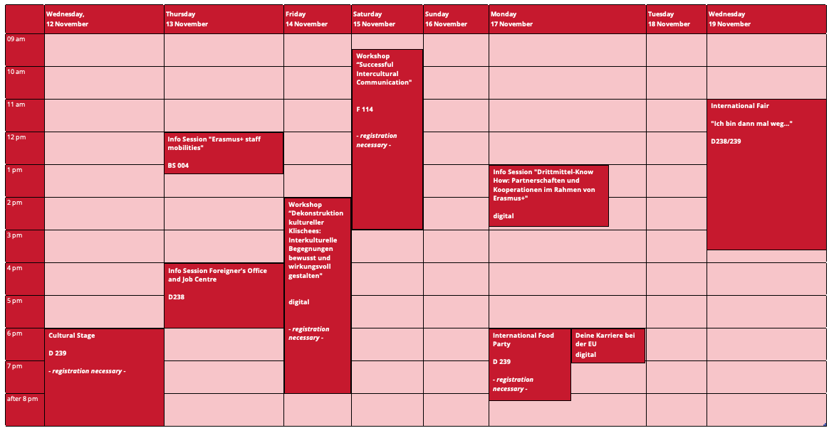 In diesem Jahr findet an der Universität Koblenz vom 12. bis 19. November 2025 die alljährliche International Week statt. Alle Studierenden und Mitarbeiternden der Universität sind eingeladen, an den verschiedenen Veranstaltungen der International Week teilzunehmen. Das Programm wird neben social events und Info-Workshops vor allem auch die alljährliche Auslandsmesse "Ich bin dann mal weg..." beinhalten, die Informationsvorträge und Messestände rund um die Planung des Auslandsaufenthalts bietet. Die Auslandsmesse findet am 19. November 2025 statt. Den Auftakt bildet die Cultural Stage am 12. November, welche dieses Jahr zum dritten Mal die Interkulturalität der Universität auf die Bühne bringt.