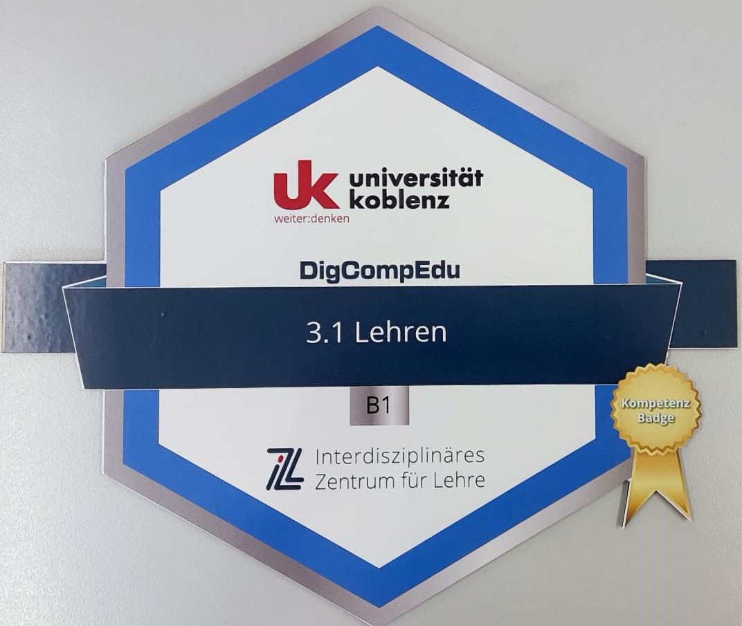 Am 24. September wurde im Rahmen der diesjährigen hochschuldidaktischen Autumn School des Interdisziplinären Zentrums für Lehre (IZL) das erste Kompetenz-Badge an der Universität Koblenz vergeben. Erhalten hat das Badge der Privatdozent Dr. Thomas Brühne aus den Händen von Prof. Dr. Constanze Juchem Grundmann, Vizepräsidentin für Studium und Lehre, und Dr. Peter Ferdinand, Geschäftsführer des IZL, die ihm zu diesem Anlass symbolisch eine haptische Replik des ansonsten digitalen Badges übergaben.