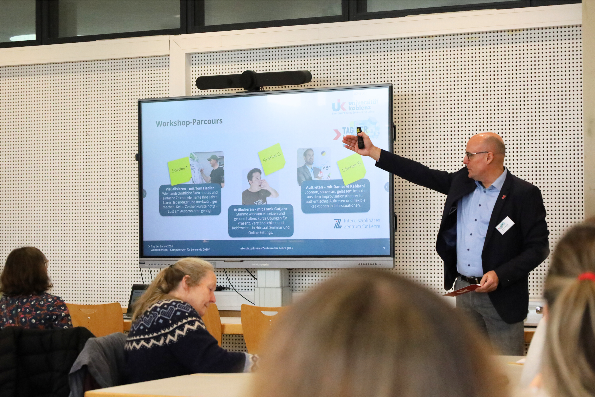 Den Abschluss des Parcous bildete Daniel Al Kabbani mit einem lebendigen Workshop zum Thema Auftreten. Inspiriert vom Improvisationstheater verband er Impulse aus der Bühne mit konkreten Situationen aus Lehre und Hochschulalltag. In kurzen, aktivierenden Übungen zeigte er, wie spontanes, souveränes und gelassenes Handeln gelingen kann – selbst dann, wenn etwas Unvorhergesehenes passiert.