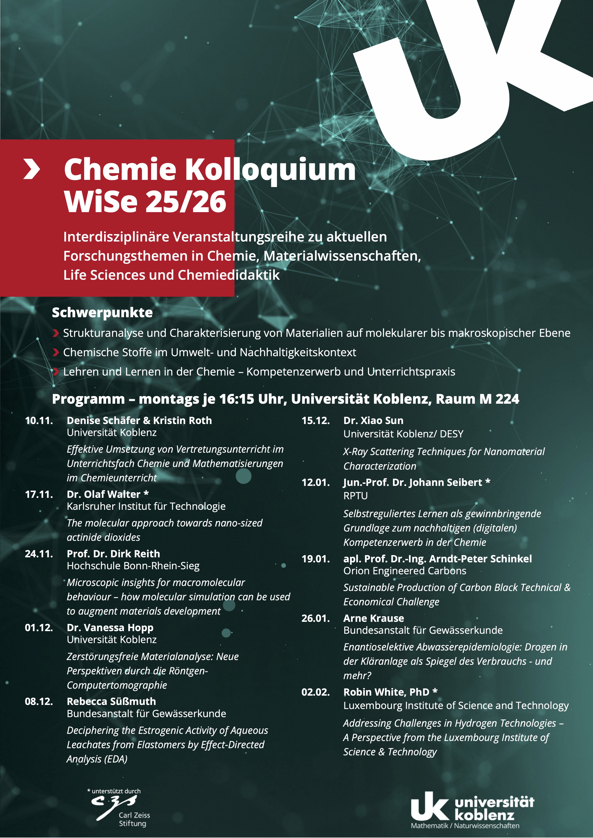 Am 10.11.2025 startet das interdisziplinäre Kolloquium der Abteilung Chemie. Interessierte sind herzlich zu einer Teilnahme eingeladen. Alle weiteren Informationen entnehmen Sie bitte der folgenden Übersicht.