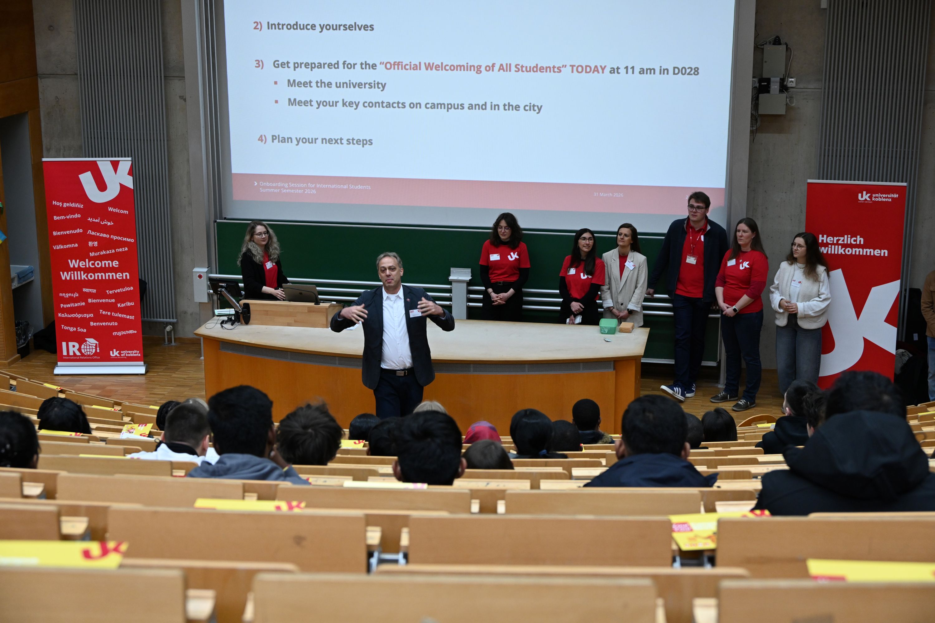 In der Eröffnungsveranstaltung am 31. März 2026 begrüßten unter anderem Universitätspräsident Prof. Dr. Stefan Wehner und die Vizepräsidentin für Studium und Lehre Prof. Dr. Constanze Juchem-Grundmann die neuen Studierenden und stellten ihnen die Universität Koblenz und wichtige Kontaktpersonen sowie Anlaufstellen, die die Studierenden im Laufe ihres Studiums begleiten, vor.