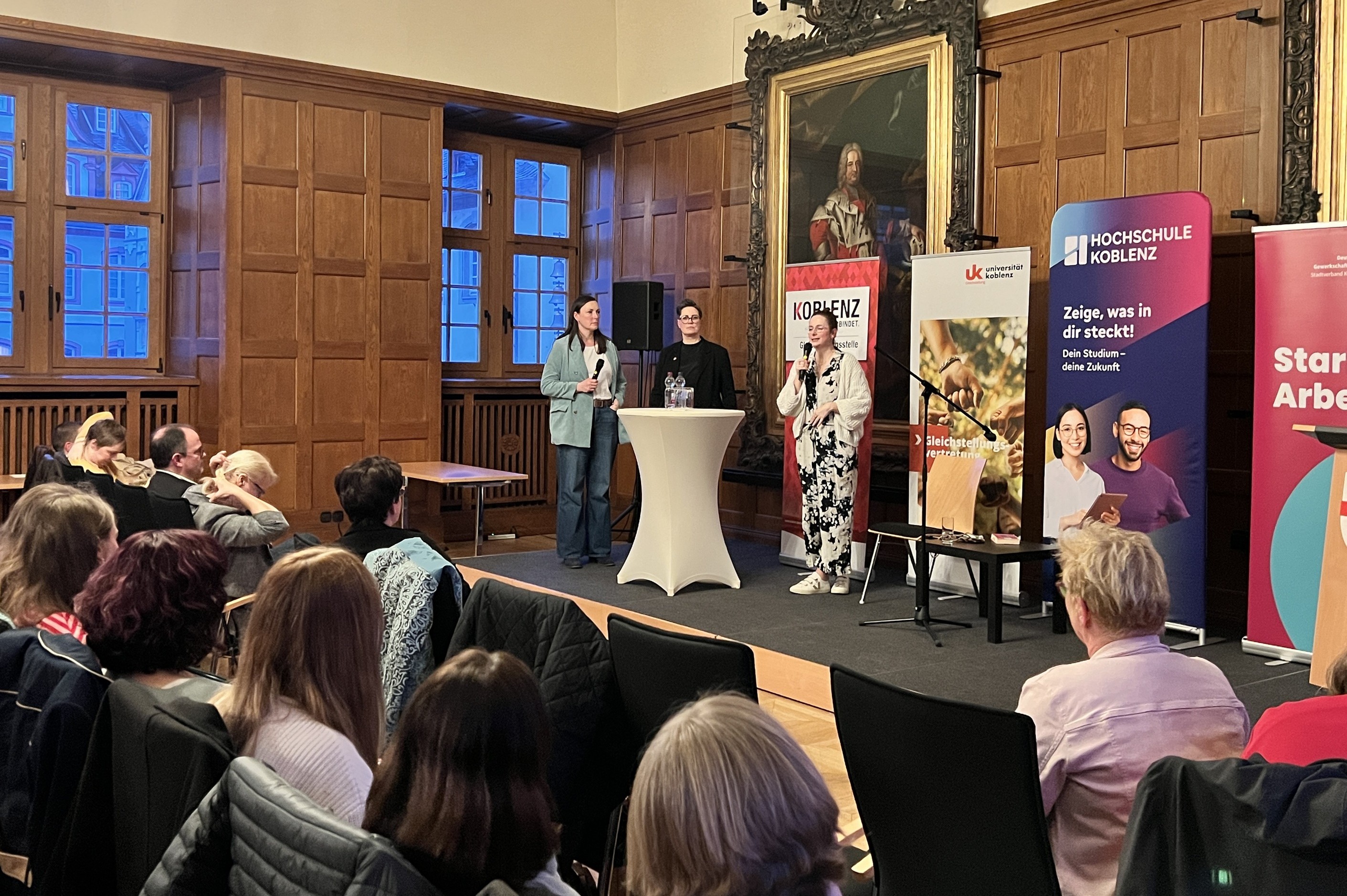 Moderiert wurde die Veranstaltung von der Gleichstellungsbeauftragten der Stadt Koblenz, Meike Baumann. In ihren Grußworten betonten die Vertreter*innen aus Gewerkschaften, Hochschulen und Stadt die anhaltende Bedeutung des Internationalen Frauentags für Politik und Gesellschaft. Für die Gewerkschaften sprachen die Gewerkschaftssekretärinnen Edith Sauerbier vom DGB und Corinne Schneider von ver.di. Die Hochschulen wurden durch die Zentralen Gleichstellungsbeauftragten Dr. Tanja Gnosa von der Universität Koblenz sowie Anne Quander von der Hochschule Koblenz vertreten. Ein weiteres Grußwort sprach der Beigeordnete für Bildung und Kultur der Stadt Koblenz, Ingo Schneider. Initiiert wurde die Veranstaltung von Maria Anton, Hochschule Koblenz.