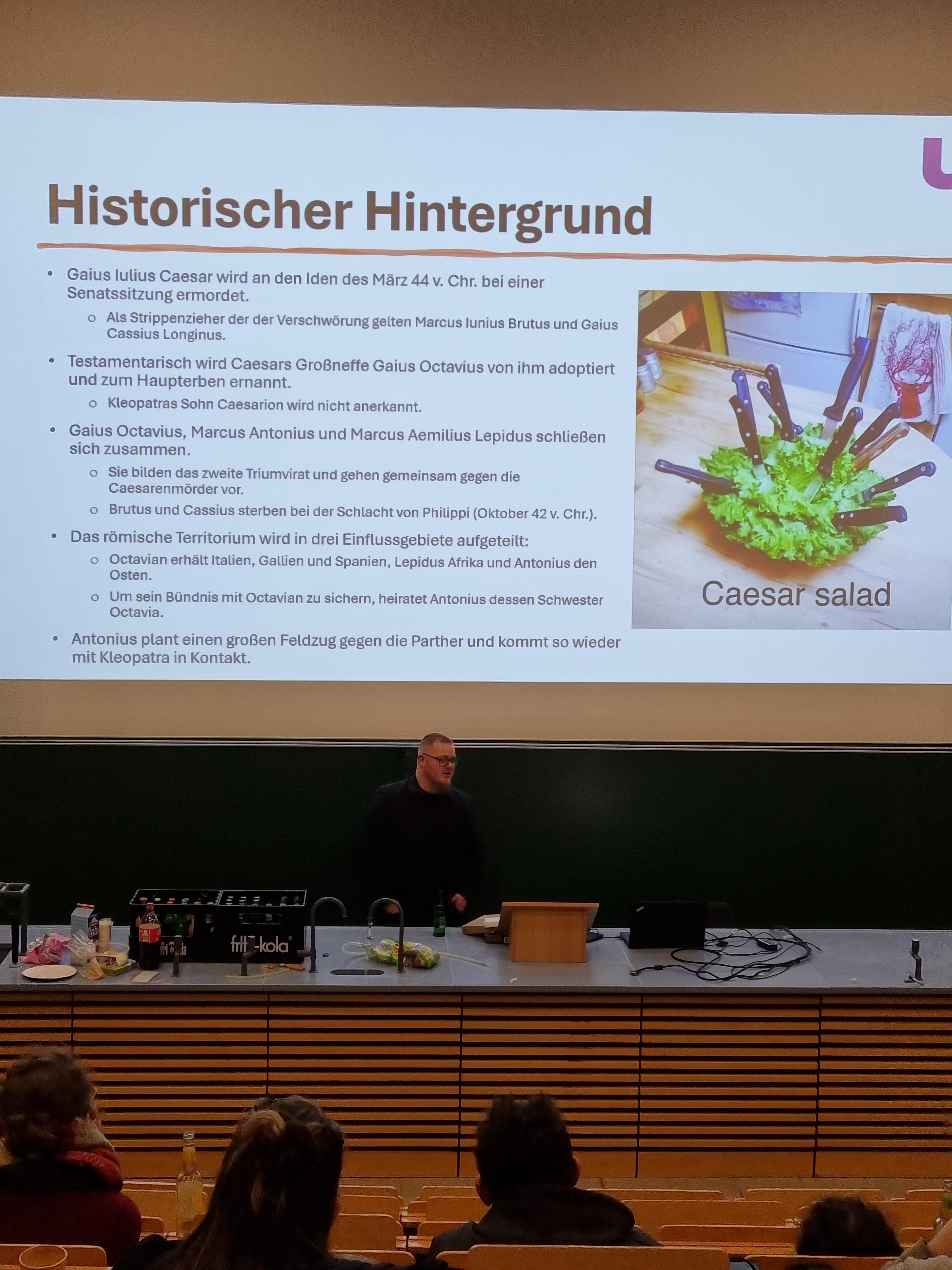 Gegen Ende der Vorlesungszeit des Wintersemesters 2024/25 veranstaltete die AG Antike am 30.01.2025 einen Filmabend. Nach einer kurzweiligen Einführung in den Kontext des Films durch Ove Frank konnten wir, gut versorgt mit Getränken und Snacks, einen der wohl beliebtesten Filme mit Antike-Bezug schauen: Asterix erobert Rom. Vielen Dank für einen schönen, entspannten Abend!