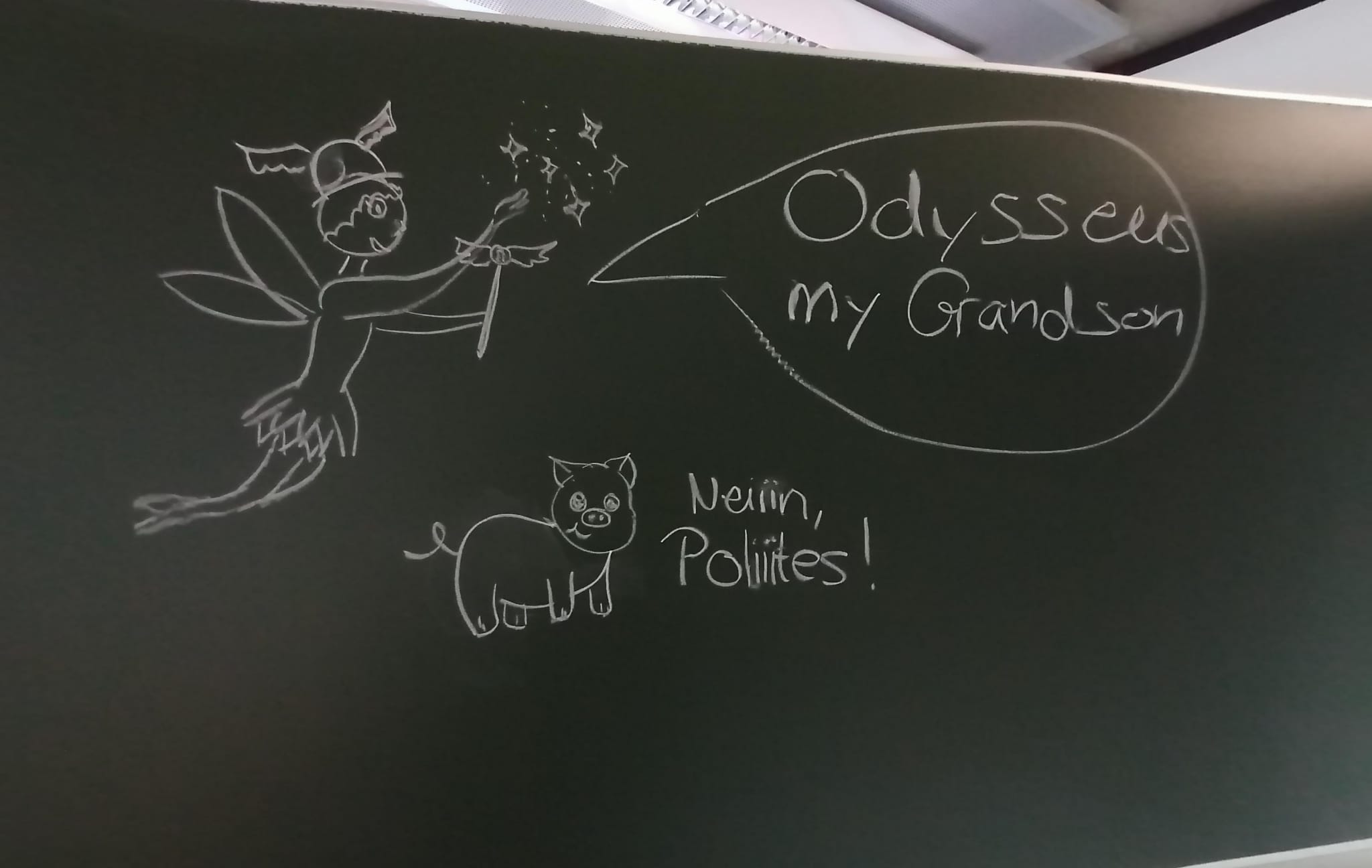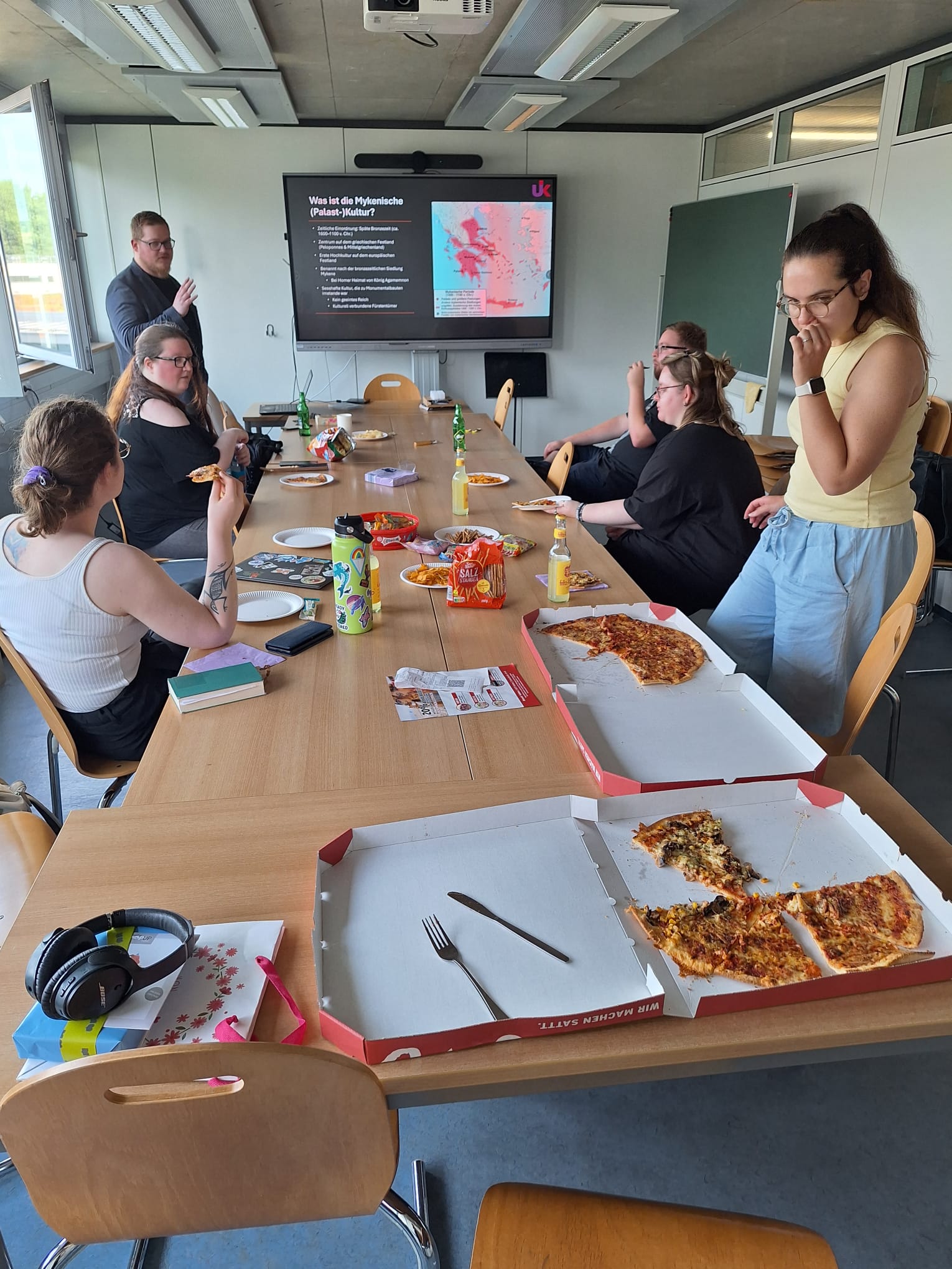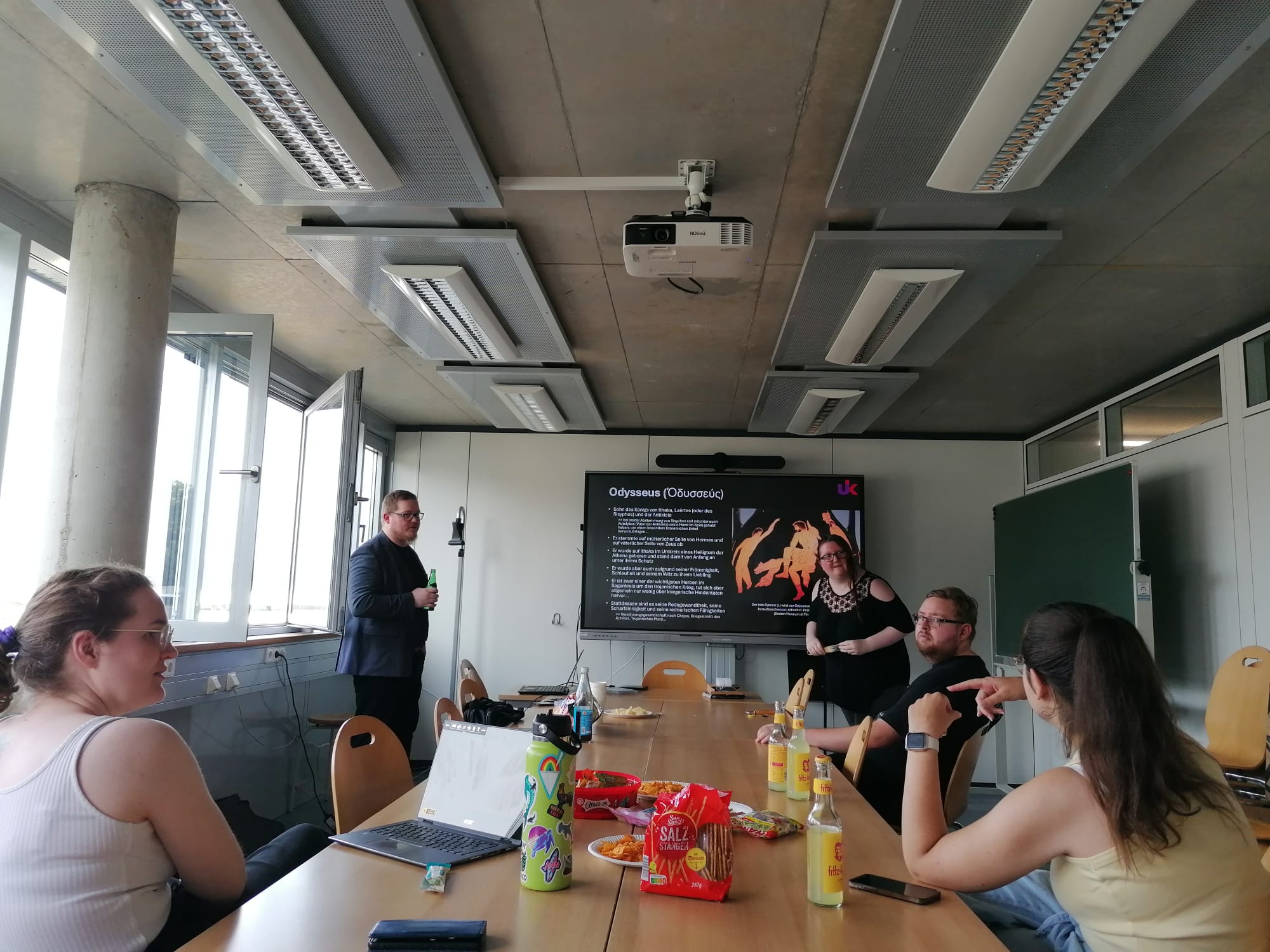 An den letzten beiden Freitagen im Juli 2025 lud die AG Antike zu einer kleinen Zeitreise in die mykenische Welt ein. Unter dem Titel: „Mythos, Legende, Geschichte? Die Abenteuer des Odysseus (1997) und der filmische Bezug zur mykenischen Palastkultur" fand ein ebenso informativer wie lebhafter Workshop statt. Magdalena Streicher, M. A., und Ove Frank, M. A. führten mit großer Fachkenntnis und spürbarer Begeisterung durch beide Termine. Ihre kulturhistorischen Erläuterungen gaben tiefe Einblicke in die mykenische Architektur und Handelsstruktur sowie in den Niedergang der Hochkultur. Auch die mythologischen Figuren der Odyssee wurden anschaulich beleuchtet. Im Anschluss an die Filmvorführung diskutierten die Teilnehmenden bei Pizza, Kuchen, Getränken und anderen Snacks enthusiastisch über die filmische Inszenierung, die historische Genauigkeit der dargestellten Personen und Geschehnisse sowie die Bezüge zu Homers Odyssee und Ilias. Vielen Dank an alle Teilnehmenden für dieses gelungene Zusammenspiel von wissenschaftlicher Neugier, filmischen Darstellungen und gemeinsamen Diskussionen.