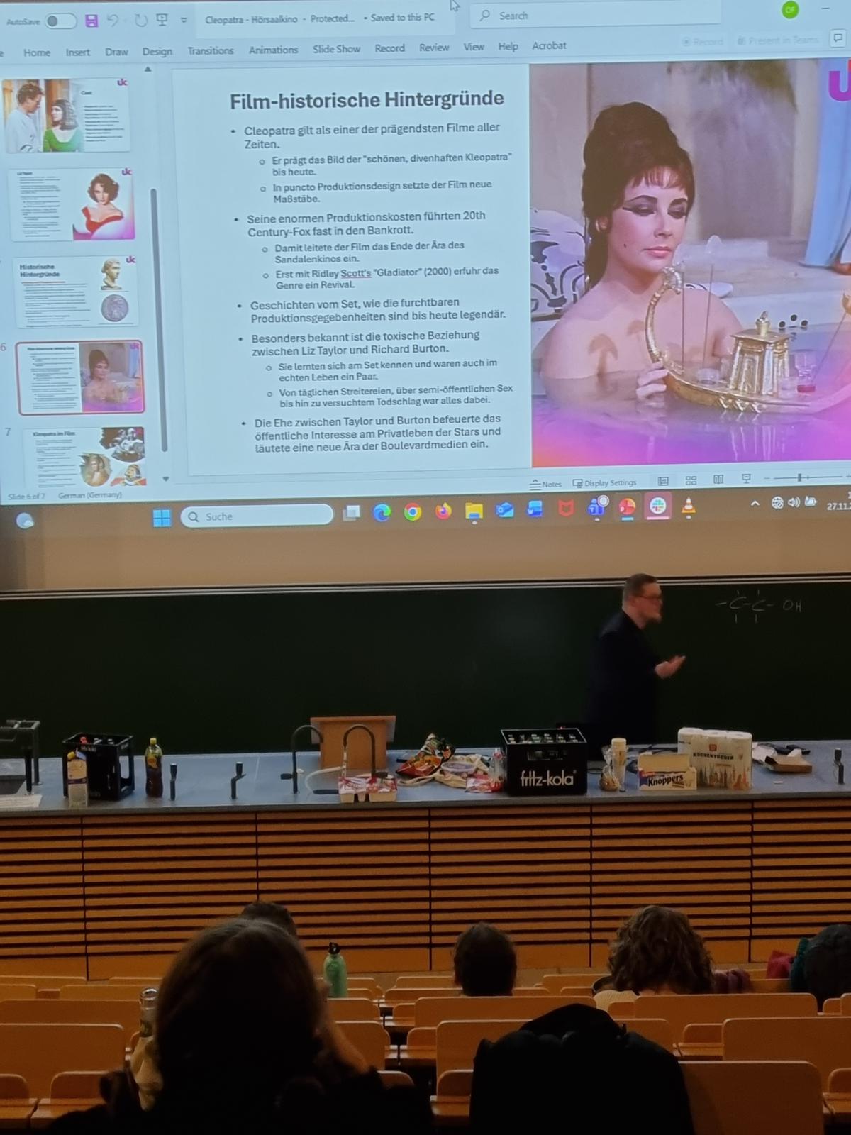 Die winterliche Jahreszeit lädt bekanntlich besonders dazu ein, der wetterbedingten Tristesse entfliehen zu wollen. Wer Regen, Schnee und Kälte für einige Stunden vergessen wollte, dem bot die AG Antike im vergangenen Semester mit dem ersten Teil des Monumentalfilms „Cleopatra“ (1963) eine farbenprächtige Abwechslung.