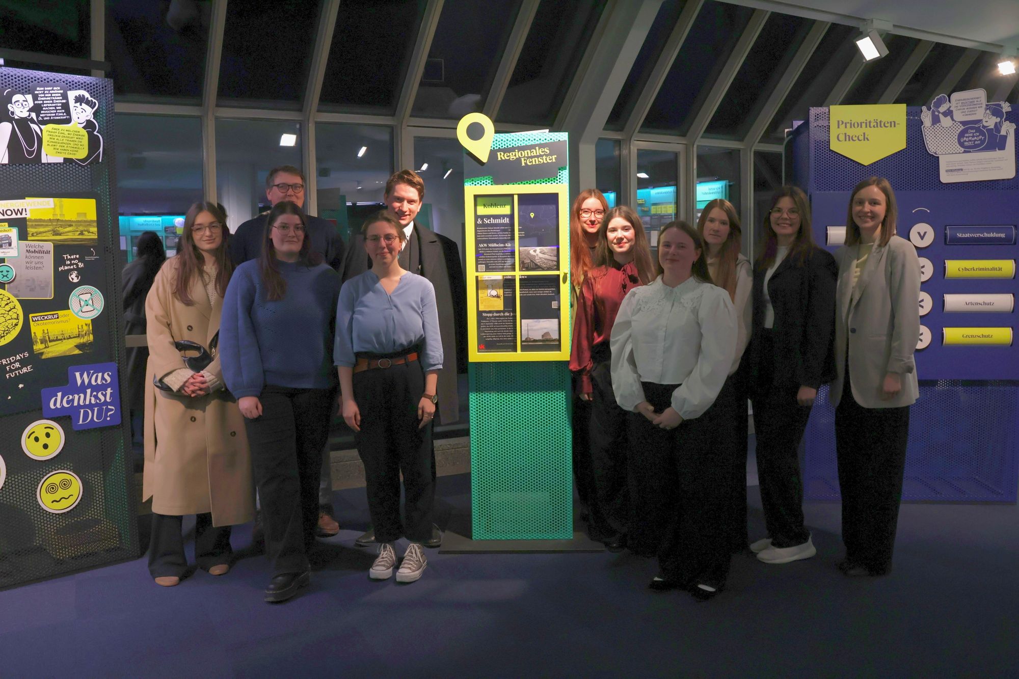 Studentinnen und Studenten des Instituts für Geschichte an der Universität Koblenz gemeinsam mit ihrem Dozenten Dr. Michael Hohlstein am sichtbarsten Gegenstand der Projektarbeit: Dem von ihnen erarbeiteten regionalen Fenster der Ausstellung, das die Auseinandersetzung um das Kernkraftwerk Mülheim-Kärlich thematisiert.