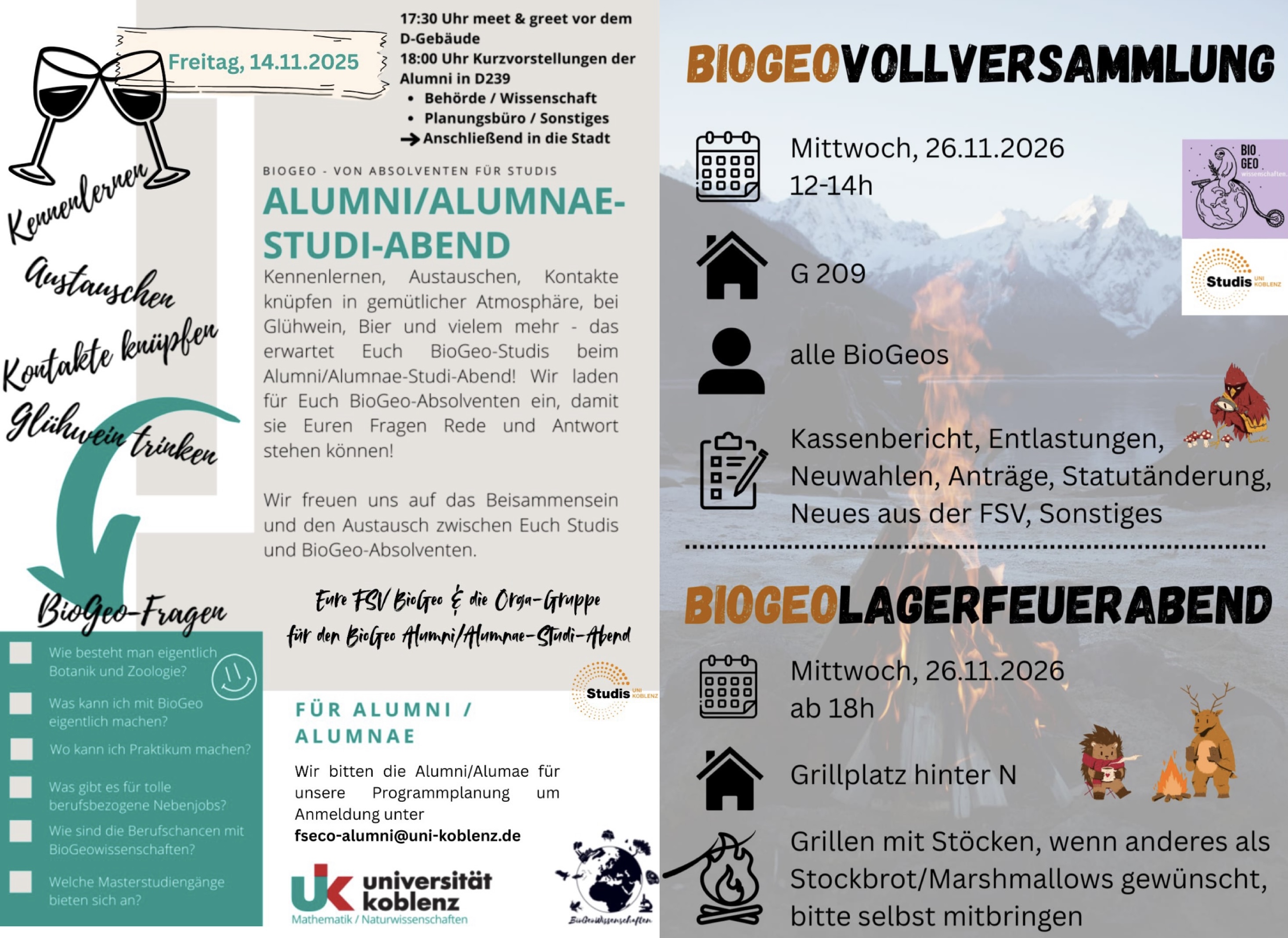 Hallo, Servus und Ahoi!! Hier findet ihr alles wichtige was ihr zur schnellen Orientierung braucht und natürlich auch wer wir überhaupt sind. Habt ihr trotzdem noch Fragen, oder braucht Hilfe? Schreibt uns doch gerne eine Mail, schaut in den BioGeo-Newsletter, oder sprecht uns an wenn ihr uns auf dem Campus erspäht <3