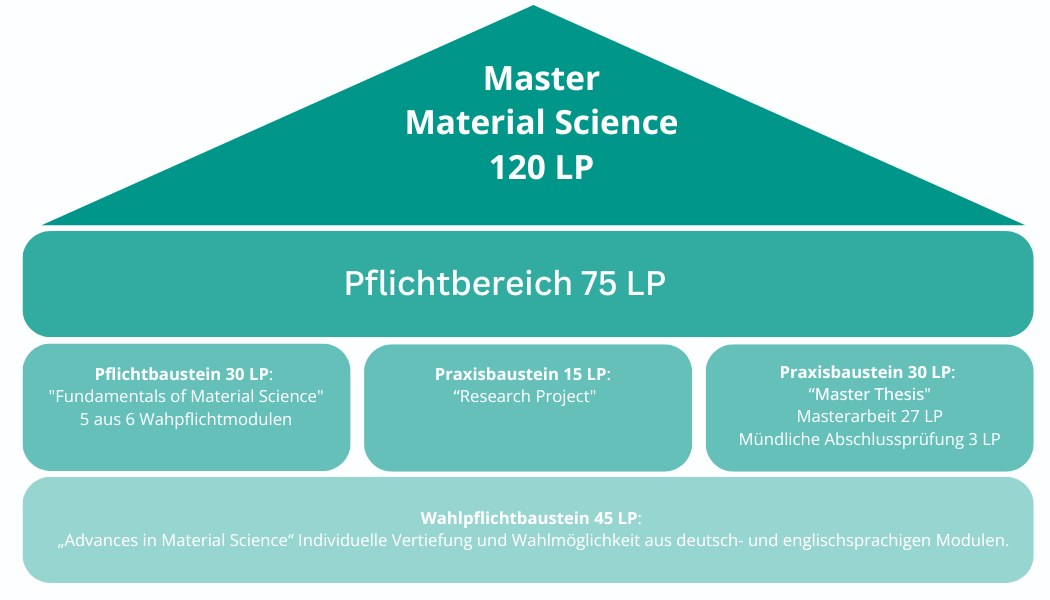 Der Masterstudiengang „MSc Material Science“ ist ein forschungsorientiertes Studienprogramm, das fachspezifisches und interdisziplinäres Wissen, Fähigkeiten und methodisches Fachwissen in der Physik und Chemie funktionaler Materialien vermittelt. Er bereitet dich auf weitere akademische Qualifikationen (wie eine Promotion) oder auf eine Karriere in Bereichen vor, die mit Materialwissenschaften zu tun haben. Der Studiengang umfasst 120 ECTS-Punkte und hat eine Regelstudienzeit von vier Semestern. Dieser international ausgerichtete Masterstudiengang wird sowohl in den Pflicht- als auch in den Wahlpflichtereichen in englischer Sprache unterrichtet.