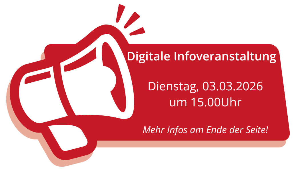 In unserer digitalen Infoveranstaltung stellen wir Dir den Studiengang vor, zeigen Dir die Möglichkeiten und es ist Platz für all Deine Fragen!
