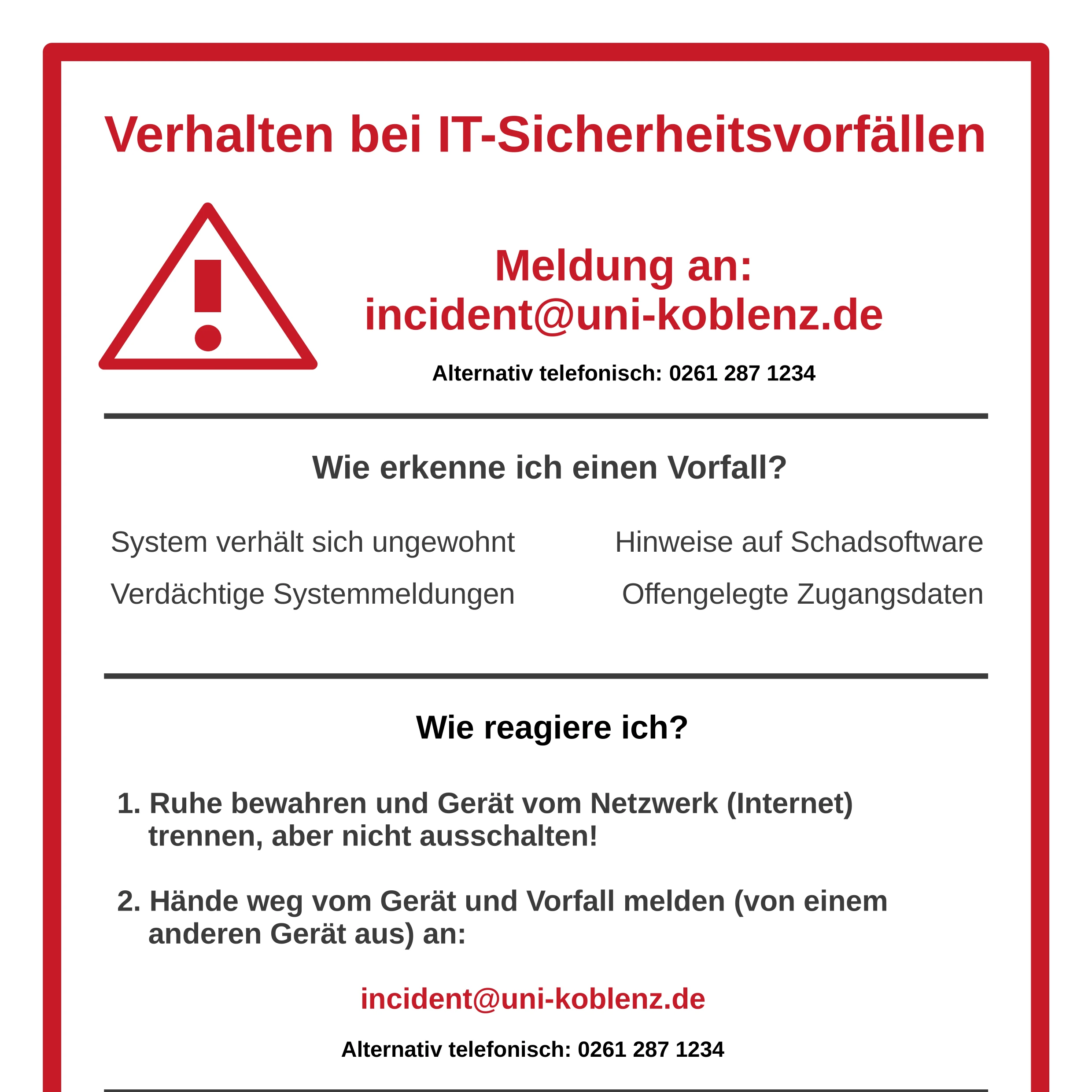 Die Stabsstelle Informationssicherheit und Datenschutz ist direkt dem Präsidenten zugeordnet und dient als erste Anlaufstelle für Fragen und Belange der Informationssicherheit und des Datenschutzes an der Universität Koblenz. Die Stabsstelle setzt sich für die Sicherheit der Informationssysteme und den Schutz personenbezogener Daten ein. Ziel ist es, ein einheitliches und gesetzeskonformes Informationssicherheits- und Datenschutzniveau zu etablieren und damit ein vertrauensvolles und sicheres Umfeld zu schaffen und gleichzeitig die Forschungs-, Lehr- und Verwaltungsprozesse der Universität bestmöglich zu unterstützen.