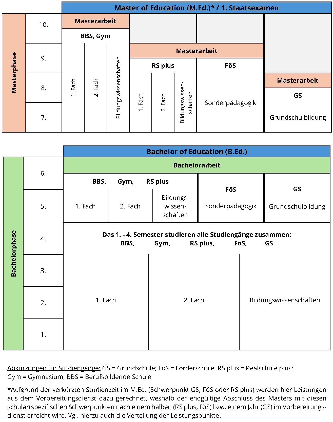 Auf das Bachelorstudium bauen die verschiedenen lehramtsspezifischen Masterstudiengänge je nach gewählter Schulart mit einer Dauer von zwei bis vier Semestern auf.