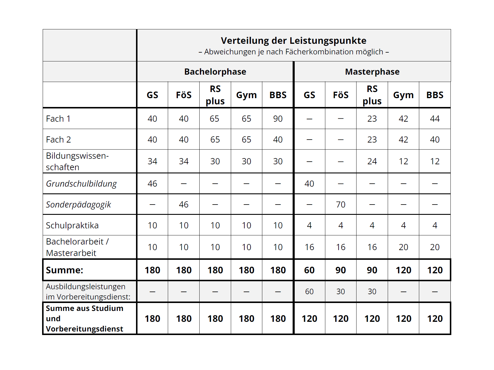 Das Studium umfasst grundsätzlich zwei schulbezogene Fächer und das Fach Bildungswissenschaften.
