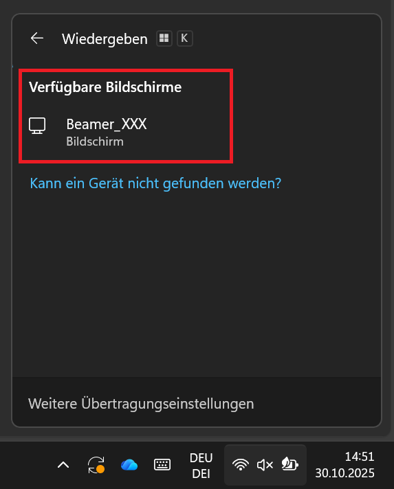 Wählen Sie in der Liste der verfügbaren Beamer den mit der Bezeichnung Ihres Raumes. Die Übertragung startet.