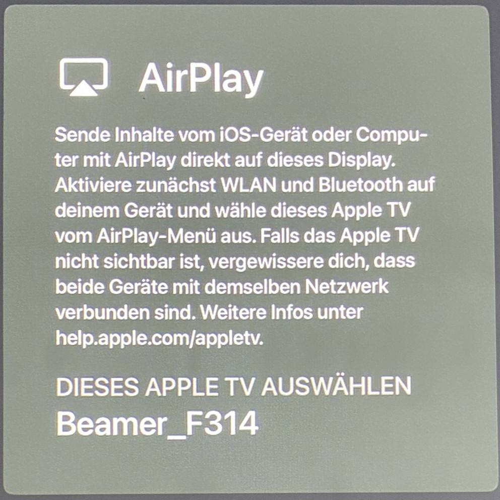 Wenn Sie noch nicht das Willkommensbild des AppleTV oder das Ausgangsbild (siehe unten) sehen, betätigen Sie die "Source Search"-Taste an der Beamer-Fernbedienung, bis AirPlay sichtbar wird: