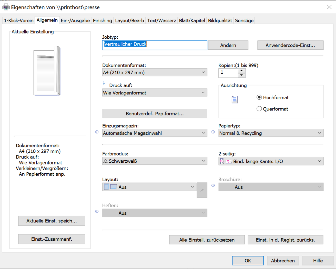 Klicken Sie in den Einstellungen des Druckers (im Druckdialog) auf die Reiterkarte Allgemein. Dort stellen Sie den Jobtyp auf Vertraulicher Druck. Beim Klick auf Ändern werden Sie nach einer Anwender-ID und einem Passwort gefragt. Den Klassifizierungscode lassen Sie unverändert. Senden Sie den Druckjob mit diesen Einstellungen an den Drucker.