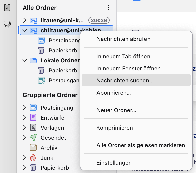 - Klicken Sie mit der rechten Maustaste auf Ihren Uni-Mailkonto-Namen (nicht auf den Ordner Posteingang) und wählen Nachrichten suchen.