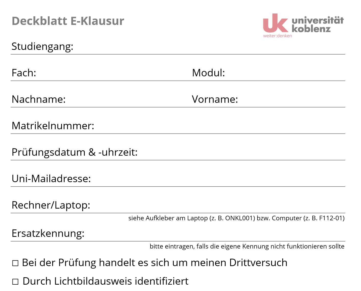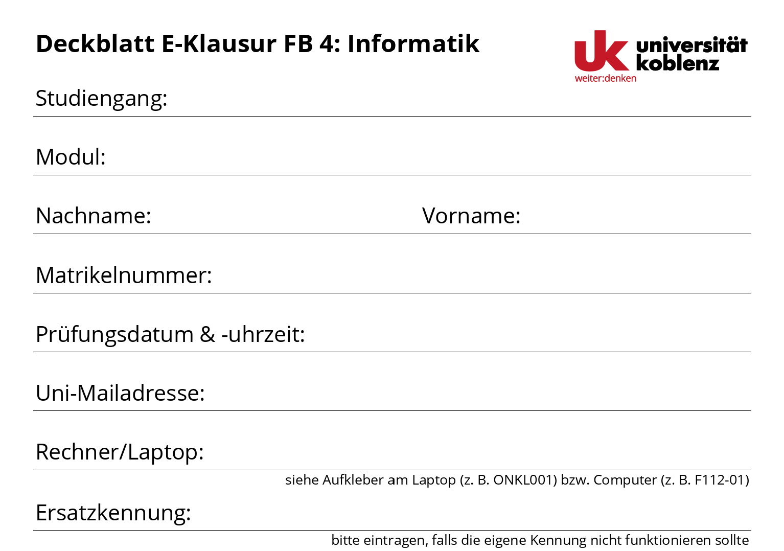 E-Klausuren werden in Präsenz und unter Aufsicht am Campus an Computern der Universität (Klausur-Laptops bzw. PCs in PC-Poolräumen) geschrieben.
