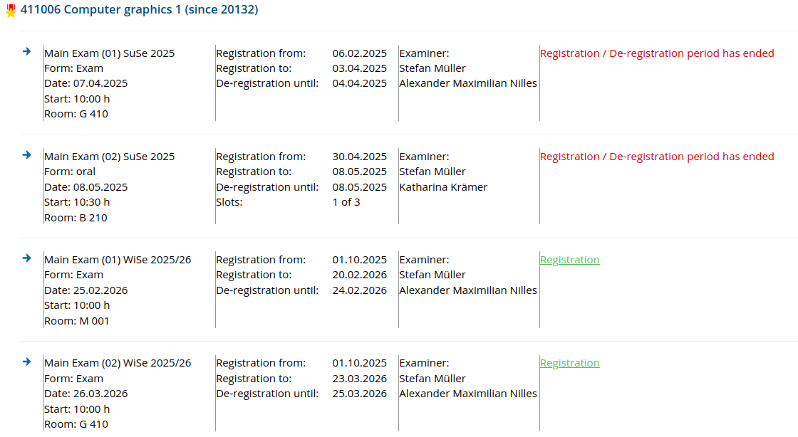 If you know the correct exam number for the exam you want to register for, you can work your way through the exam tree of your study program as follows. Example: exam number 441006 in the study course "Bachelor Computer Visualistics" according to the examination regulation of the faculty 4 (computer science) in the version of 2024: